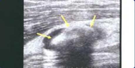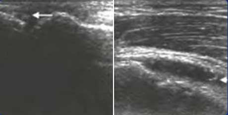 膝关节髌上囊扩张积液,可见团状强回声,并伴声影