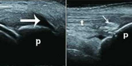 肌骨超声可检测到受累关节表现为不同程度的关节腔积液及滑膜增生。通过观察关节腔内积液是否为漂浮点状强回声来区别于其他关节炎,判定是否为痛风;通过观测关节内滑膜增厚情况,关节腔内壁是否不光滑,有无呈层状、绒毛状或结节样低回声实性突起以及滑膜上不同形态血流区分炎症为急性或慢性炎症,评判炎性反应进展程度。