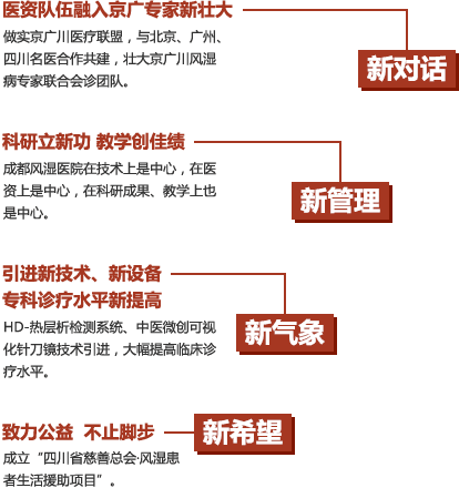2017年,成都风湿医院风湿免疫科、痛风科、脊柱外科、康复科等众科室,无论是治疗仪器、病区设施等硬件设备,还是医疗技术、服务能力能软实力都将全新提升,整体提升各科室的收治能力,保障患者在就诊期间得到最及时、最安全、最规范的医疗诊治护理。